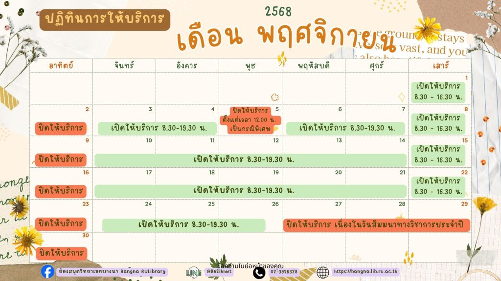 และวันพฤหัสบดีที่ 27 – วันเสาร์ที่ 29 พฤศจิกายน 2568 ปิดให้บริการ เนื่องในวันสัมมนาทางวิชาการประจำปี