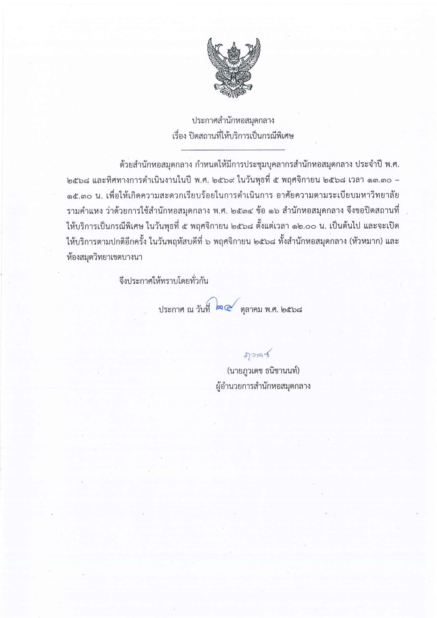 ประกาศสำนักหอสมุดกลาง เรื่องปิดสถานที่ให้บริการเป็นกรณีพิเศษ วันพุธที่ 5 พฤศจิกายน 2568