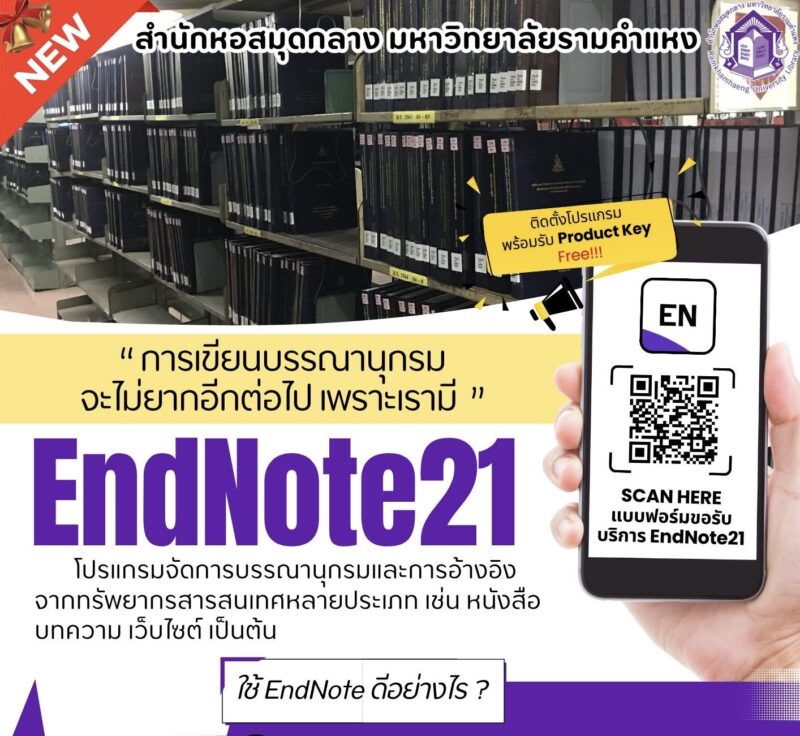 โปรแกรม EndNote 21 โปรแกรมสำหรับจัดการบรรณานุกรมและการอ้างอิงในงานวิชาการ สามารถรวบรวมจากแหล่งข้อมูลต่าง ๆ ได้แก่ ฐานข้อมูลทรัพยากรห้องสมุด (WebPAC), ฐานข้อมูลเพื่อการค้นคว้าวิจัย (Reference Databases) และอื่น ๆ โดยผู้ใช้งานสามารถสืบค้น แก้ไข จัดกลุ่มบรรณานุกรมในโปรแกรมได้ คุณสมบัติของโปรแกรม EndNote 21 คัดลอกบรรณานุกรมไปยัง Microsoft Word และ Google Docs ได้ ใช้งานโปรแกรมร่วมกันได้ จำนวน 1,000 คน รองรับข้อมูลได้ไม่จำกัด ตรวจจับบรรณานุกรมที่ซ้ำกันได้ เลือกรูปแบบบรรณานุกรมได้หลายประเภท เช่น APA, Vancouver เป็นต้น เลือกสร้างบรรณานุกรมได้หลายประเภท เช่น หนังสือ บทความ เว็บไซต์ เป็นต้น แนบไฟล์ที่เกี่ยวข้องในรายการบรรณานุกรมได้ มีการปรับปรุงโปรแกรมอย่างสม่ำเสมอ ผู้ใช้งานสามารถตรวจสอบเวอร์ชันล่าสุด หรืออัปเดตในโปรแกรมได้ทันที รายละเอียดเพิ่มเติม คลิก https://www.lib.ru.ac.th/services/endnote21.php