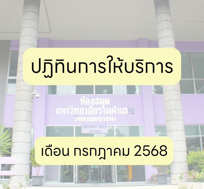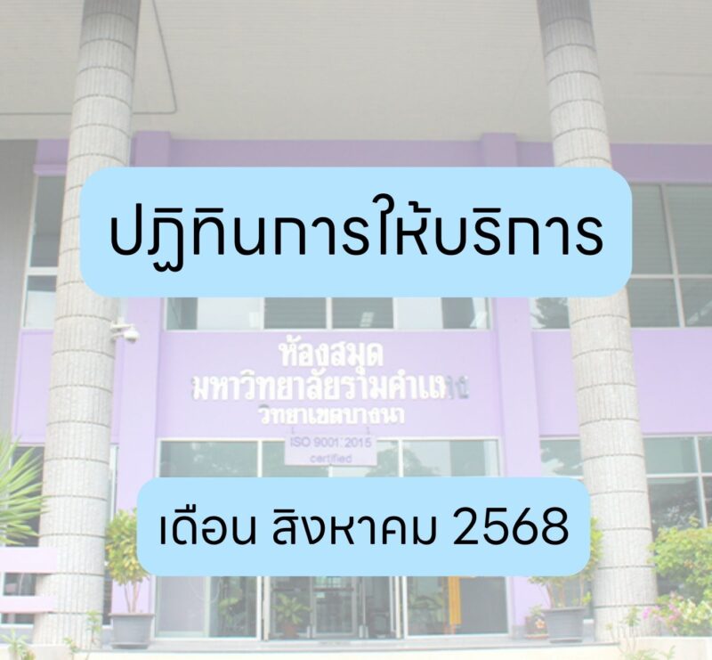 ช่วงเวลาปกติวันจันทร์ ถึงวันศุกร์ เปิดบริการเวลา 08.30-19.30 น.วันเสาร์ เปิดบริการเวลา 08.30-16.30 น.วันอาทิตย์และวันหยุดราชการประจำปี ปิดบริการ วันที่มีการปิดบริการ เดือนสิงหาคม 2568• วันอาทิตย์ที่ 3 สิงหาคม 2568• วันเสาร์ที่ 9 ถึงวันอังคารที่ 12 สิงหาคม 2568• วันอาทิตย์ที่ 17 สิงหาคม 2568• วันอาทิตย์ที่ 31 สิงหาคม 2568 *หมายเหตุ วันอาทิตย์ที่ 24 สิงหาคม 2568 เปิดให้บริการ เวลา 8.30-16.30 น. เนื่องจากเป็นช่วงเวลาที่มหาวิทยาลัยมีการจัดการสอบซ่อมภาค 2 และภาคฤดูร้อน/2567 (ส่วนกลาง) สอบถามข้อมูลเพิ่มเติมLine : @862ikhwtFacebook : ห้องสมุดวิทยาเขตบางนา Bangna RULibraryโทร : 02-3976328